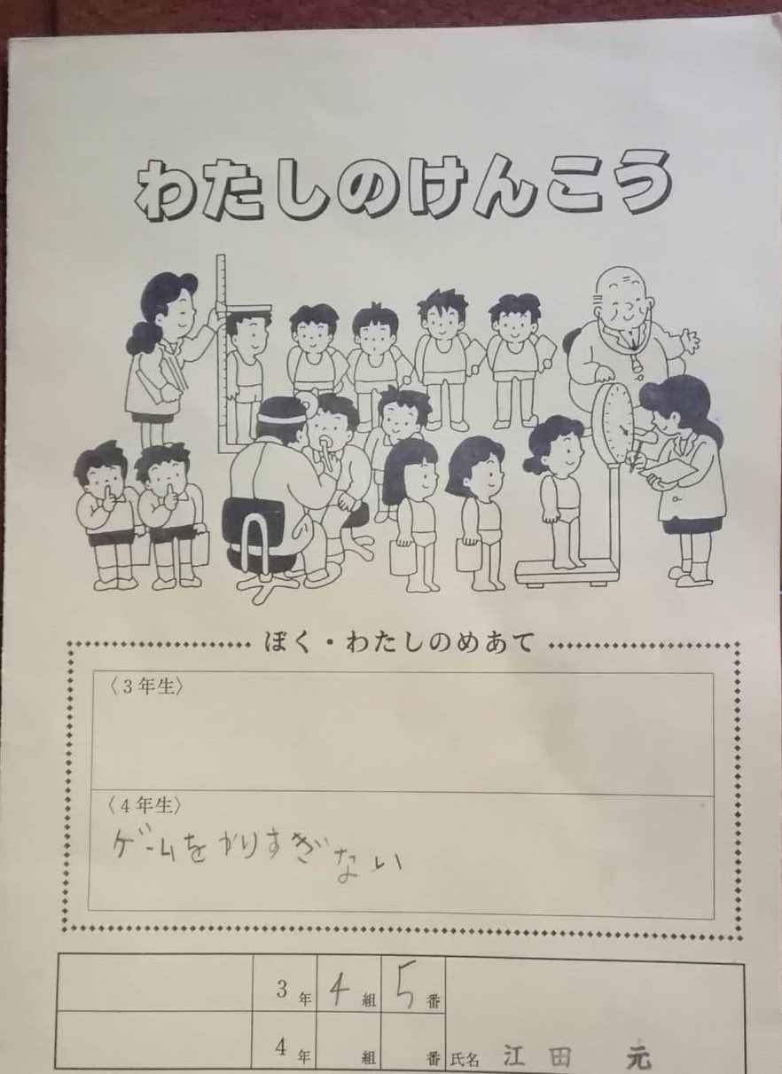 はじめしゃちょー Hajime On Twitter 小学校の時の健康診断の紙が実家で見つかったらしいんだが 小学3年生の時の目標 小学4年生の時の目標 ゲームをやりすぎない 小さい頃からゲーム中毒予備軍だったのか